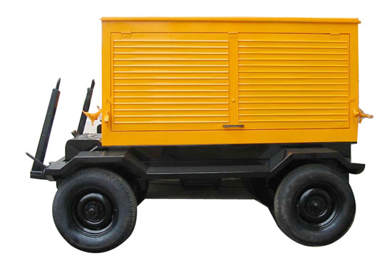 拖车车架采用槽梁焊接成框架结构,节点选择合理、强度高、刚性好;同时装有钢板弹簧悬架结构;拖车采用高度可调节插销式牵引架,适用于各种高度牵引车;采用圆形钢管焊接直通式车轴,结构紧凑,安全可靠;车架四角设有机械式支撑装置,配备惯性行车制动、驻车制动和脱离应急制动,确保机组在各种状况下的安全;车架前端设有支撑轮,具备承受机组垂直载荷的功能的同时还具备导向功能;整车配备转向和刹车指示灯,同时装有尾灯标准插头。.